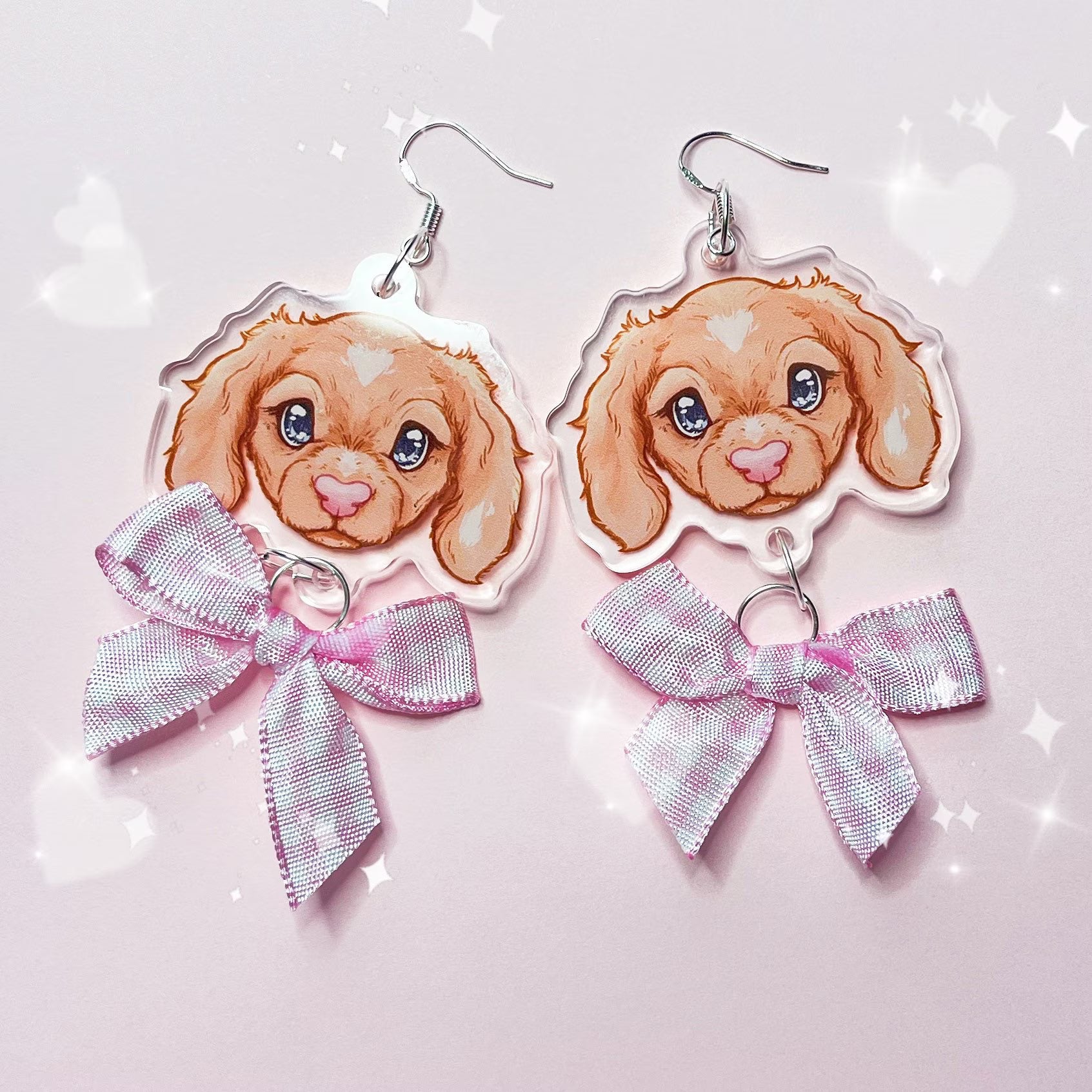A pair of chandelier charm earrings measuring 1.5 inches tall with a dangling pink gingham bow.