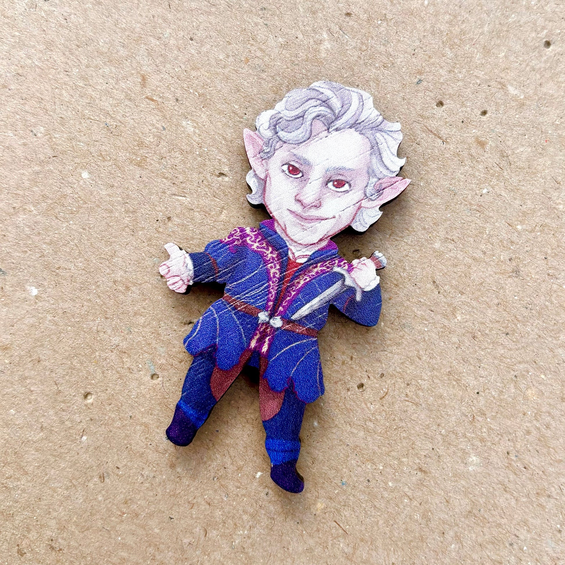 I’m so excited about these pins! These stunning 2” walnut veneer wooden pins come in 8 different designs based on the 9 main companions from Baldur’s Gate 3.