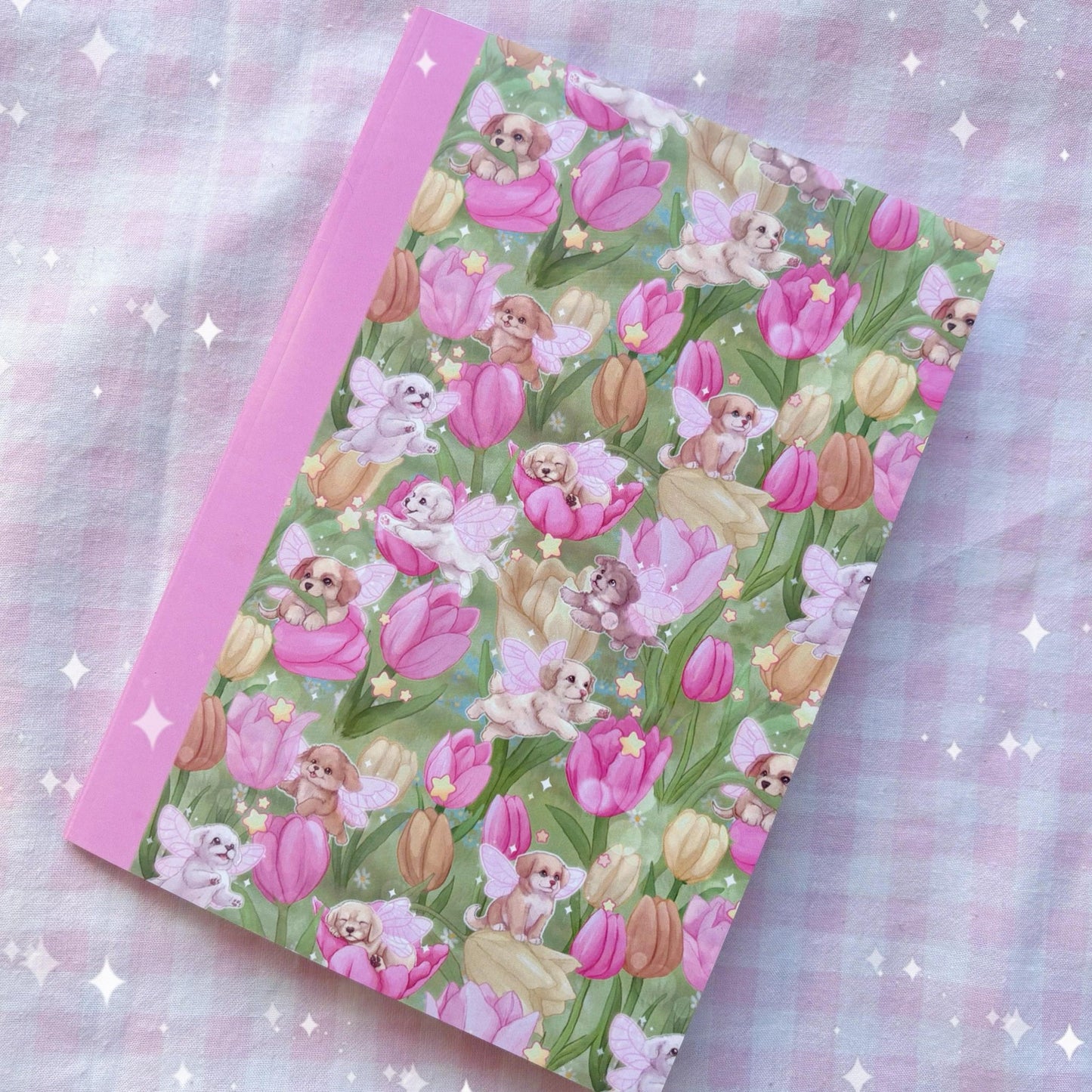 Colourful, digitally printed 48-page saddle-stitched notebooks featuring a repeating pattern of fairy puppies frolicking in a field of tulips! Inside pages are dotted.