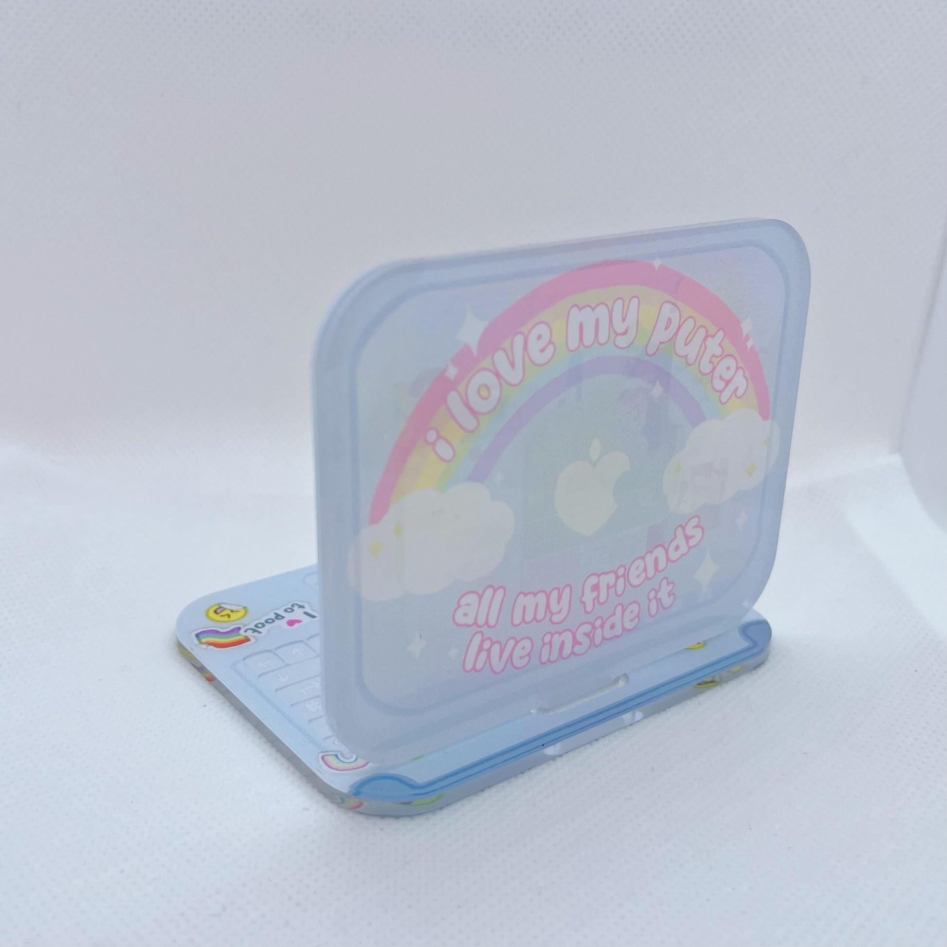 An acrylic standee of a friendly little fella enjoying spending time with his pals on the puter! Also doubles as a phone stand!