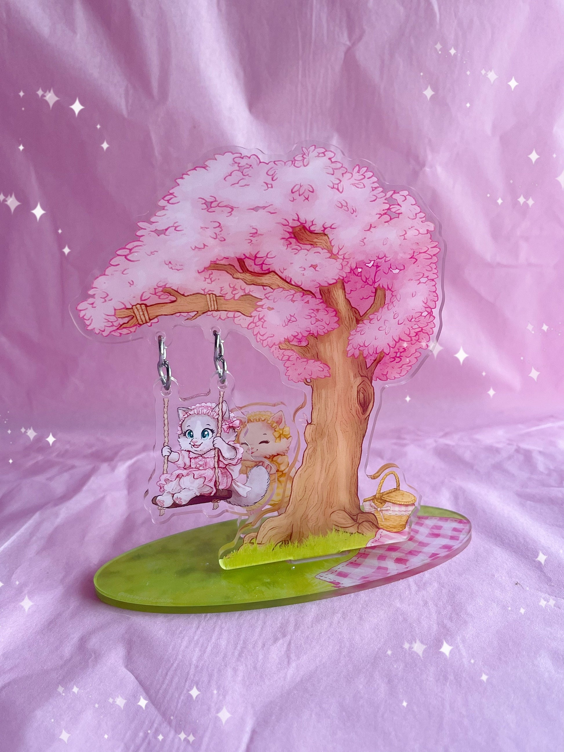 A sweet little acrylic standee diorama of two kitties in lolita taking a break from their picnic to swing on the rope swing!