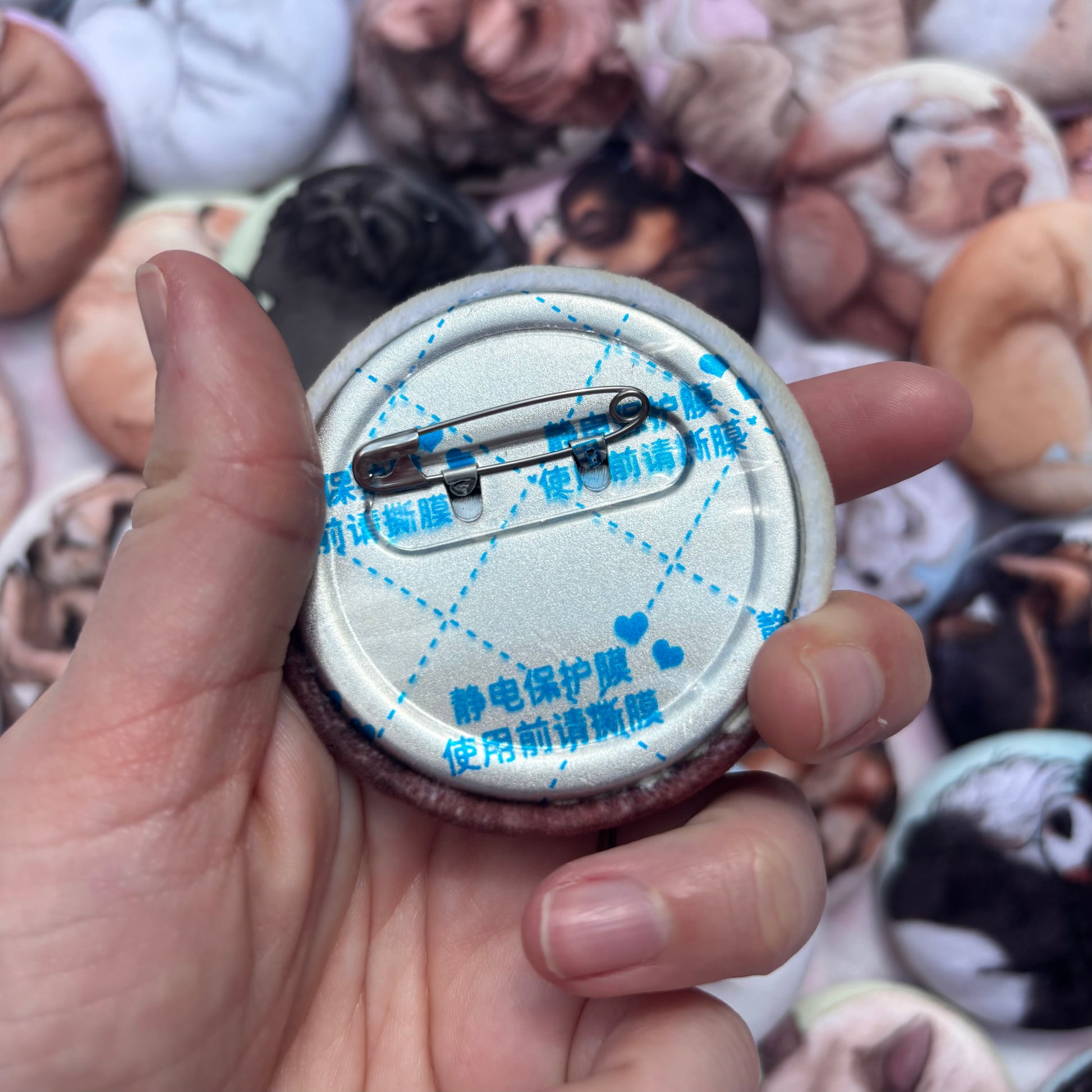 This 58mm badge is a tinplate pin-back badge with a super soft furry surface.