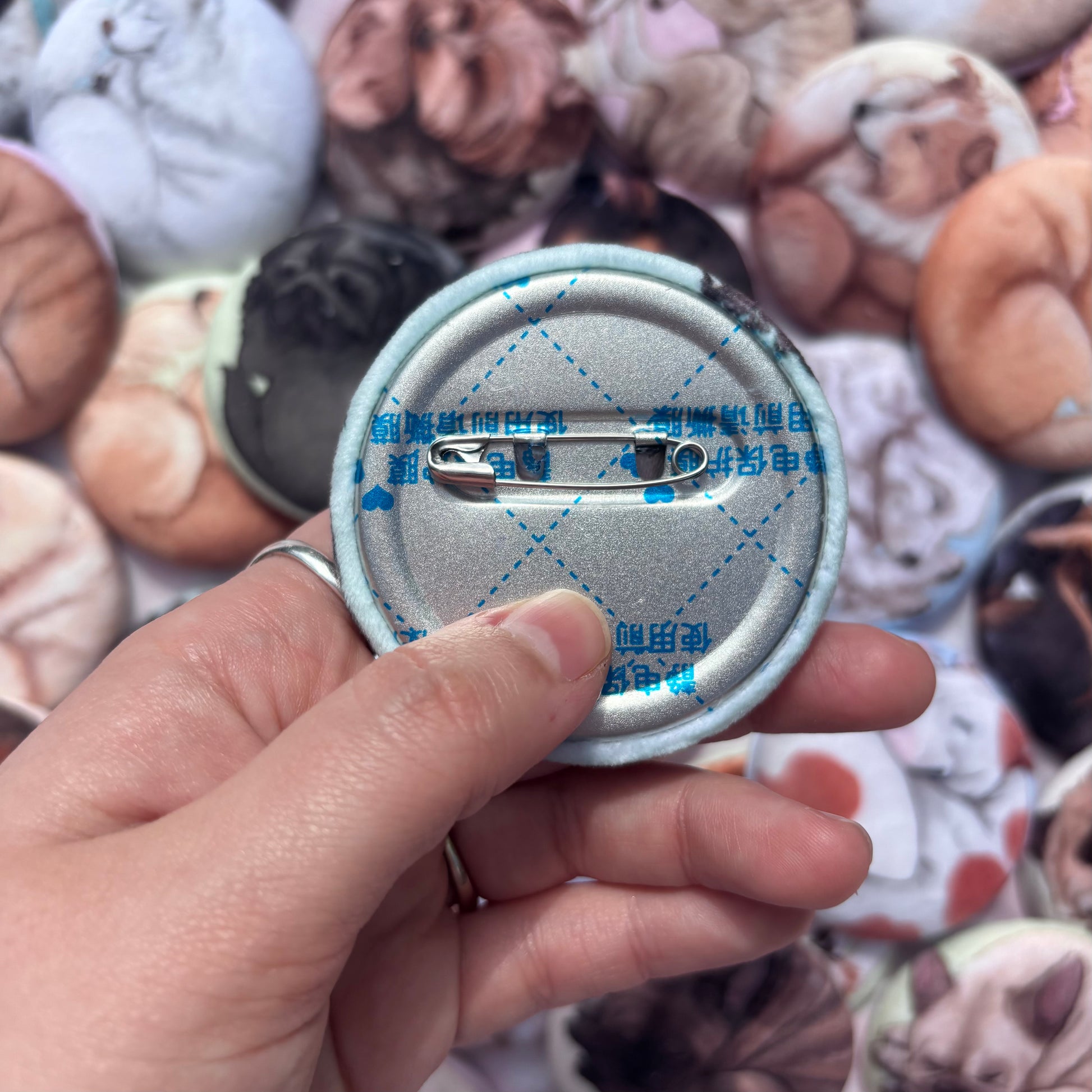 This 58mm badge is a tinplate pin-back badge with a super soft furry surface.