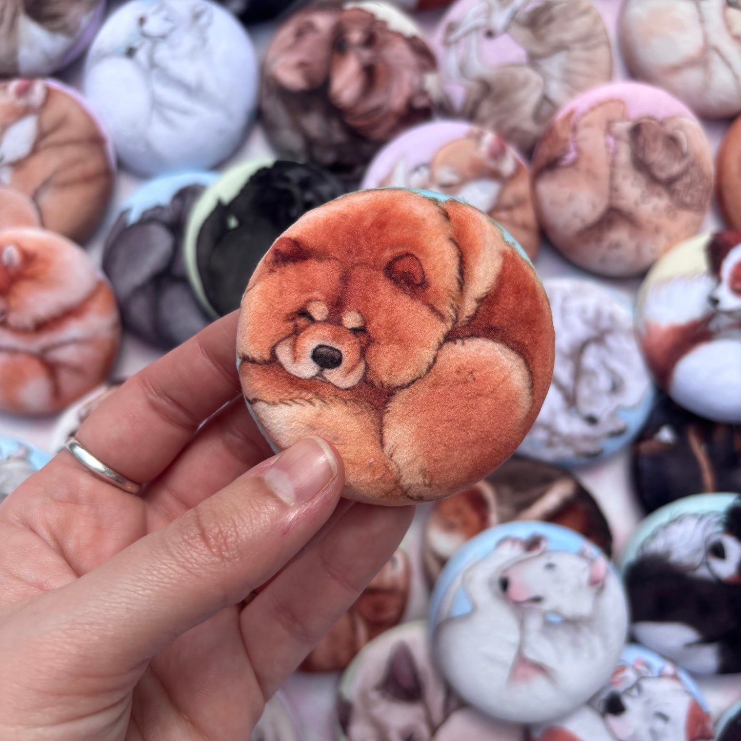 Share your love and for your favourite kind of dogs with this sweet and sleepy plush pin.