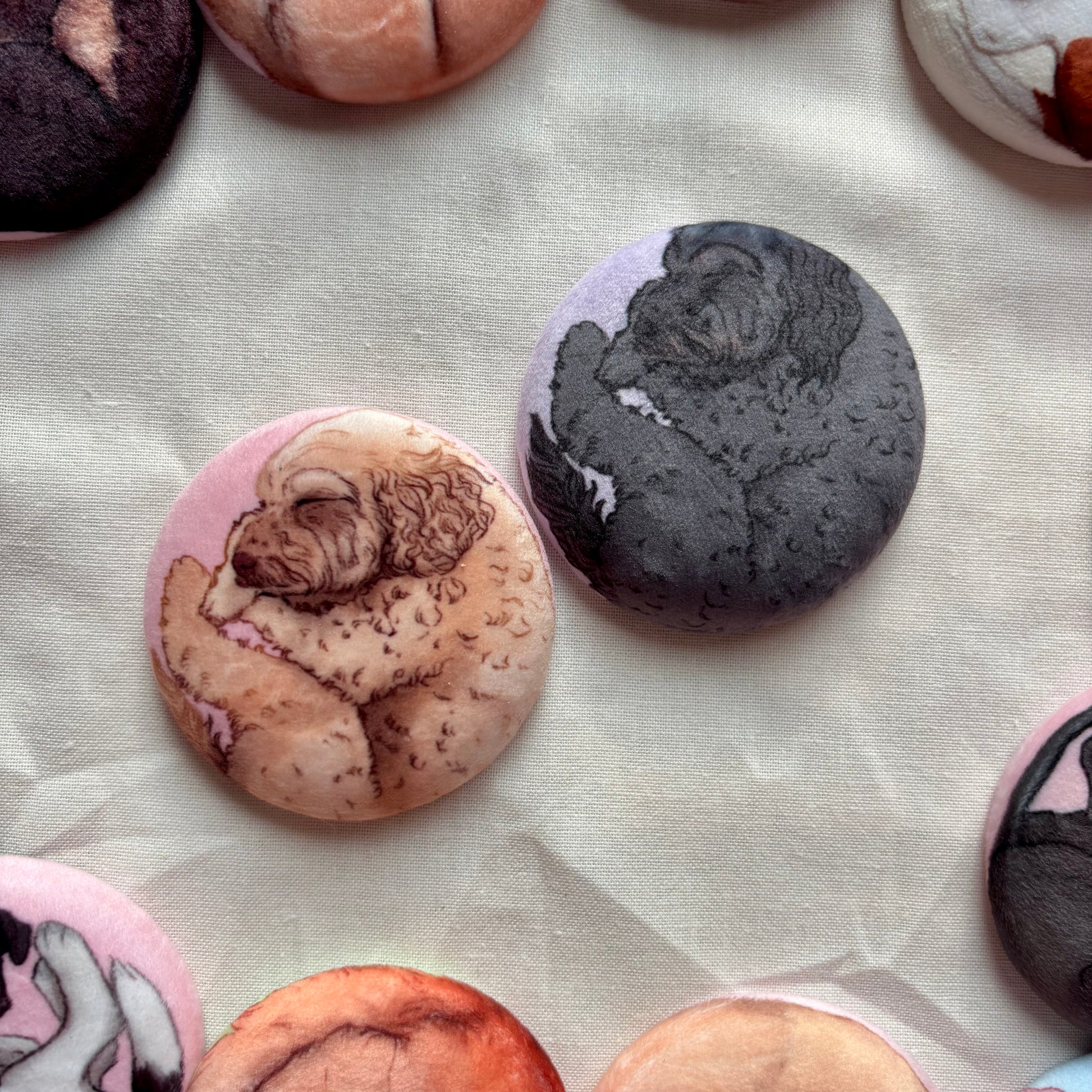 Share your love and for your favourite kind of dogs with this sweet and sleepy plush pin.