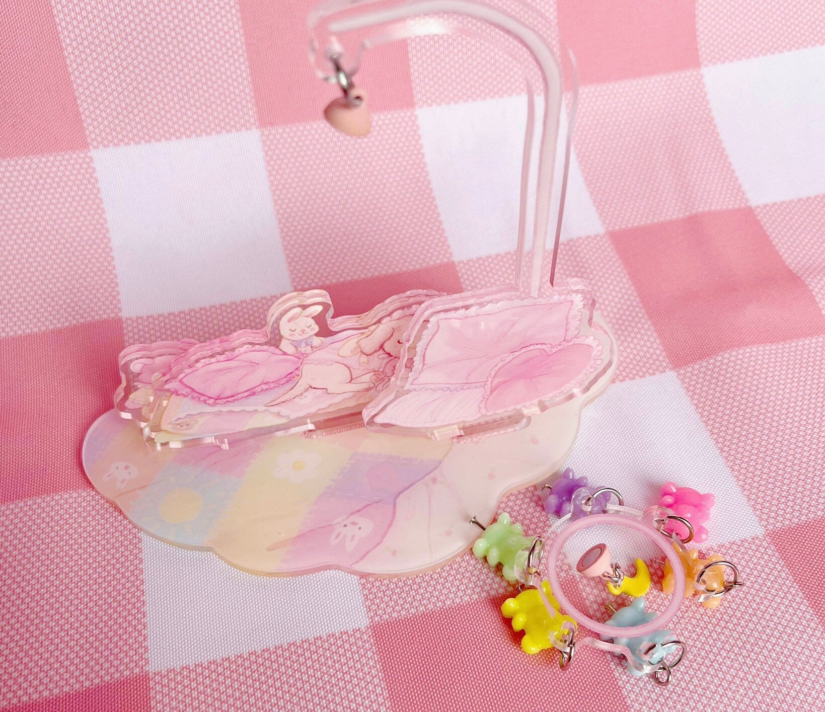 An adorable acrylic standee piece, 13.5cm wide and 10.5cm in total height. Features a sweet snoozing puppy, surrounded by soft pillows and plushies!
