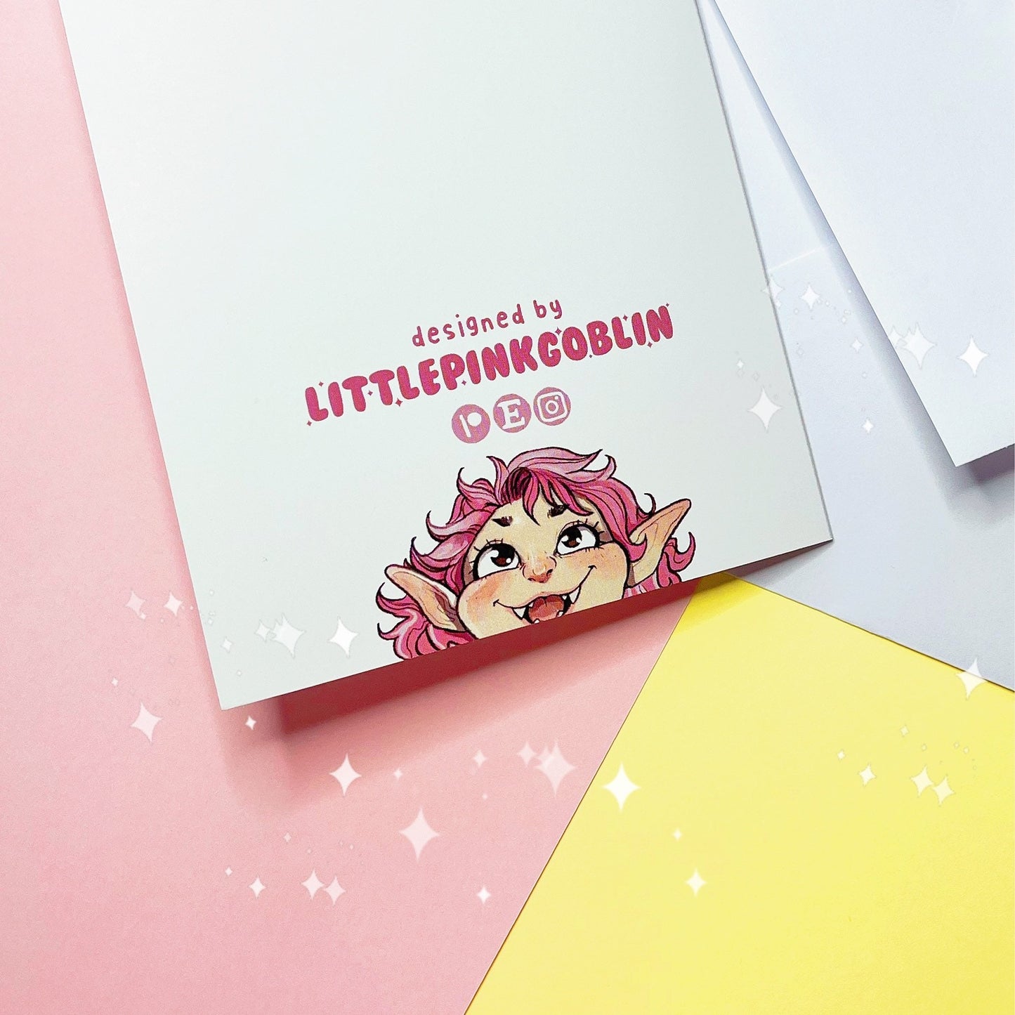 A cute A5-sized greetings card featuring a digitally illustrated raccoon with a flower. Blank inside for your own message. Includes one envelope per card order.