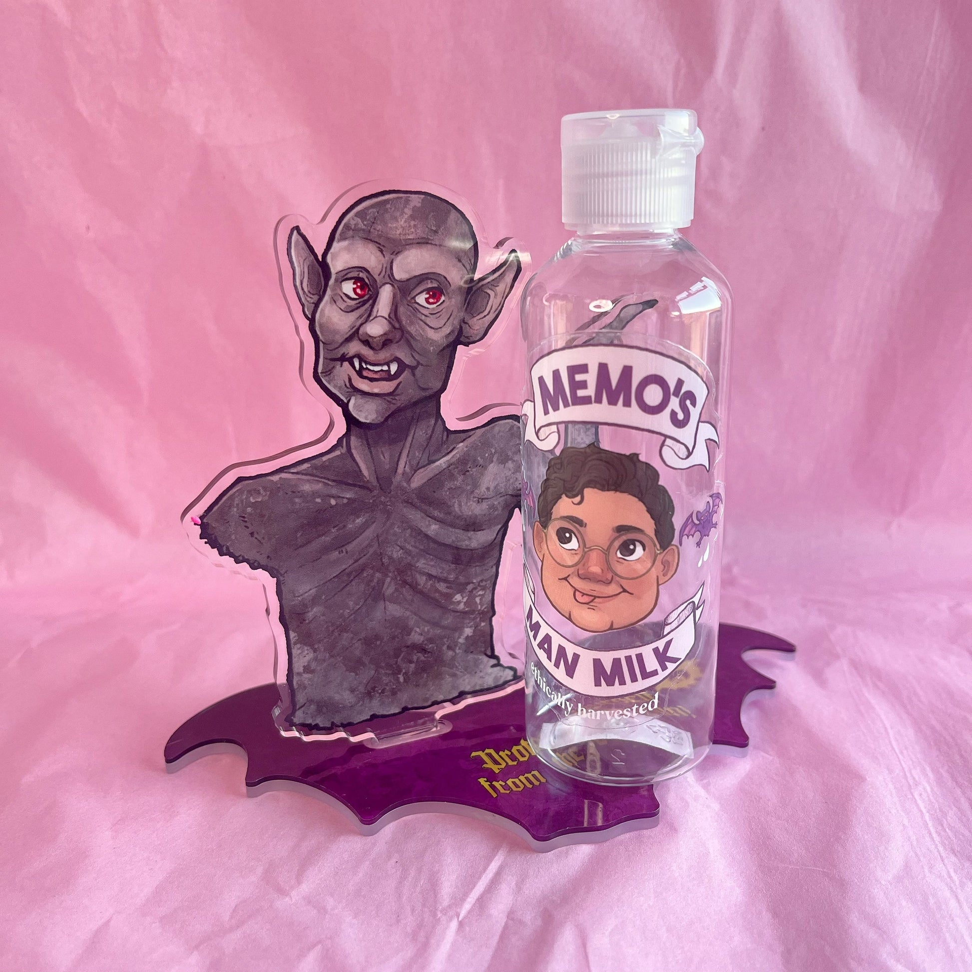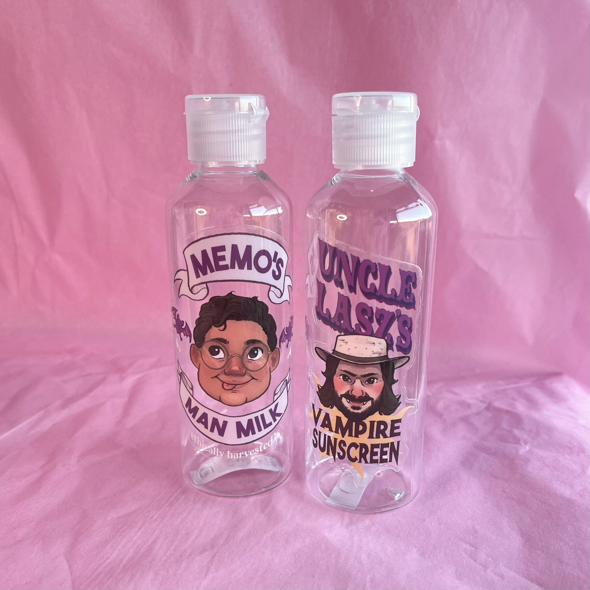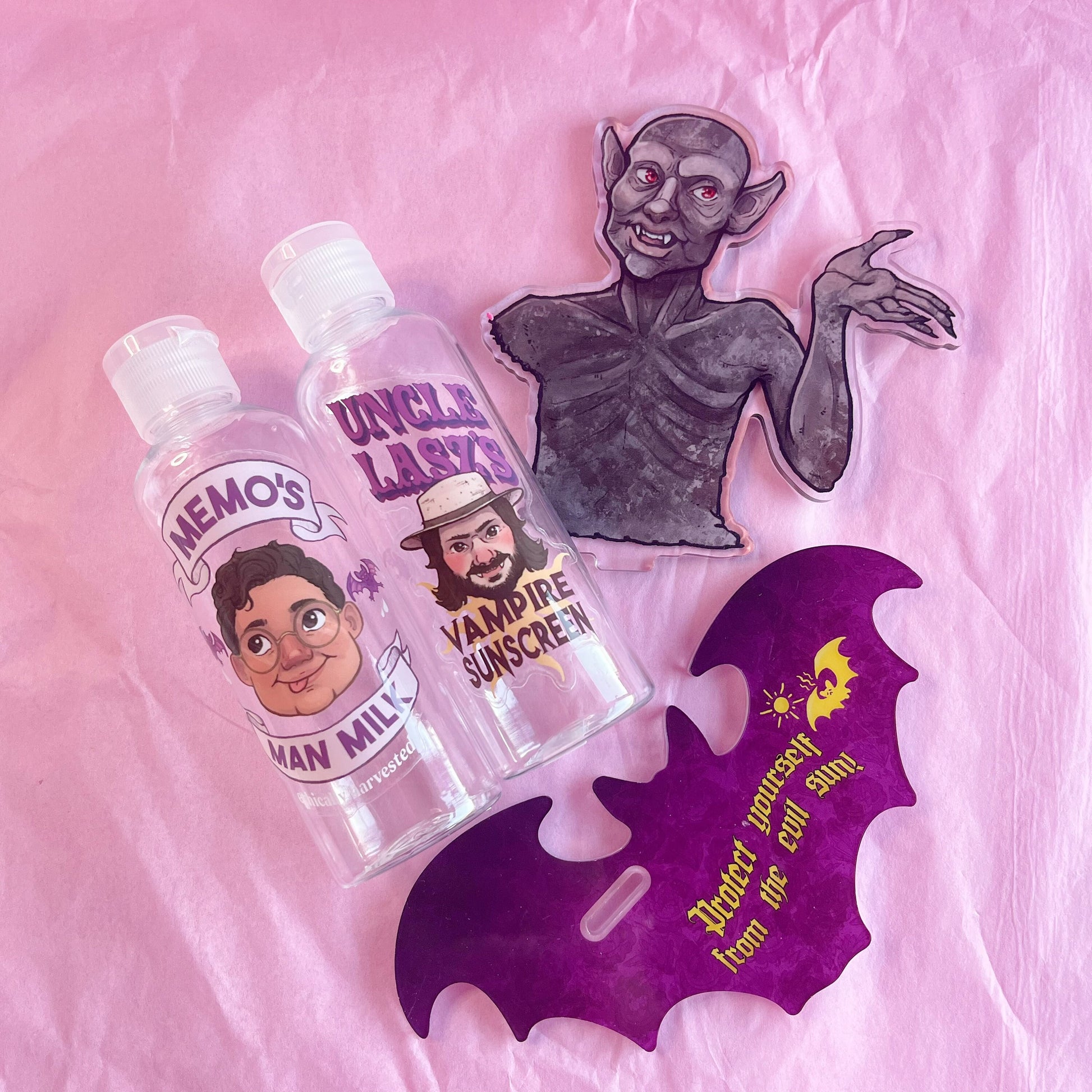 This product was born as a reminder to myself to always put on my sunscreen, or else I'll end up looking like the sunburnt, crispy Baron Afonas! This skincare set comes with two decorated bottles, one of Laszlo's patented vampire sunscreen from season 5 for your personal SFP, and a bottle of Memo's Man Milk for your moisturiser!